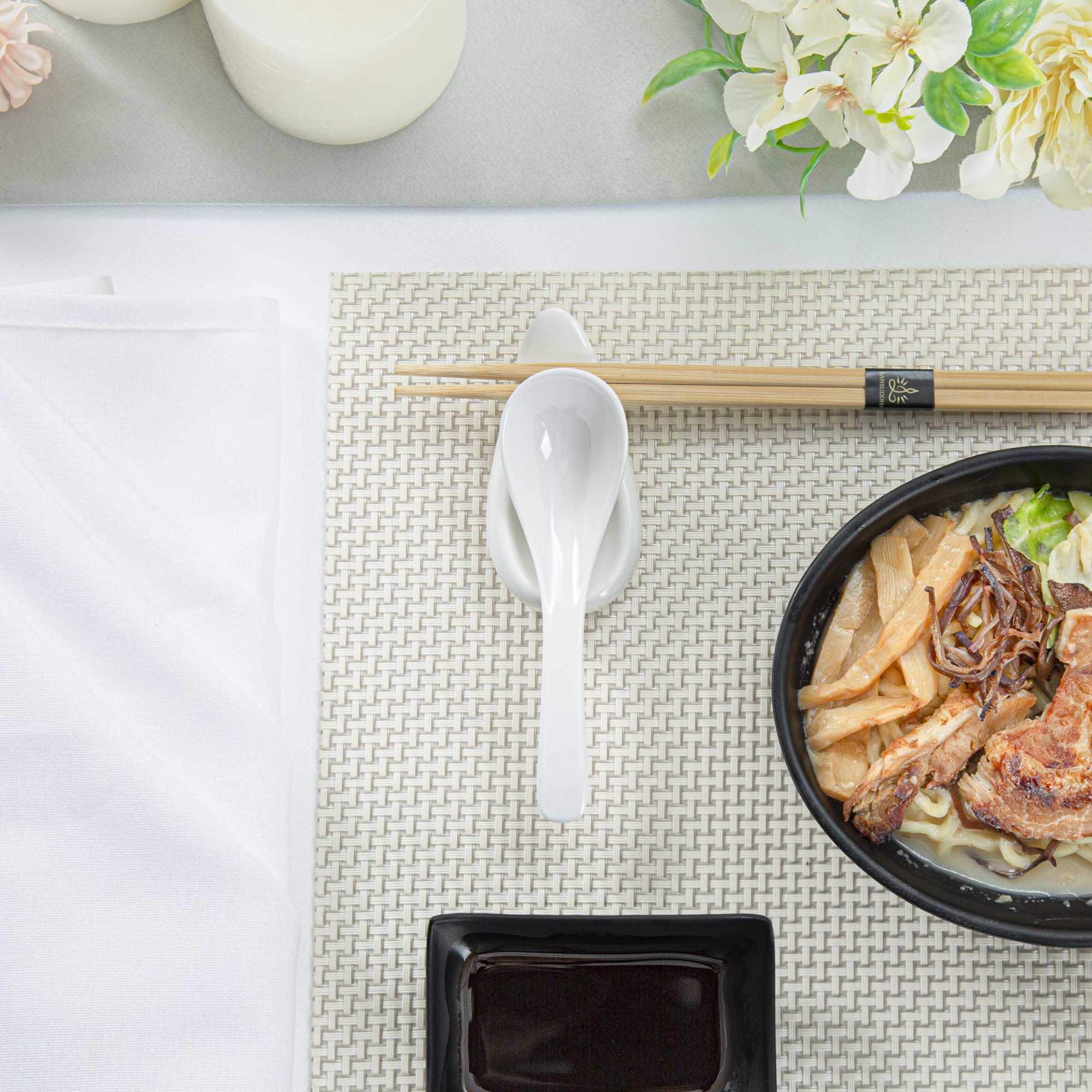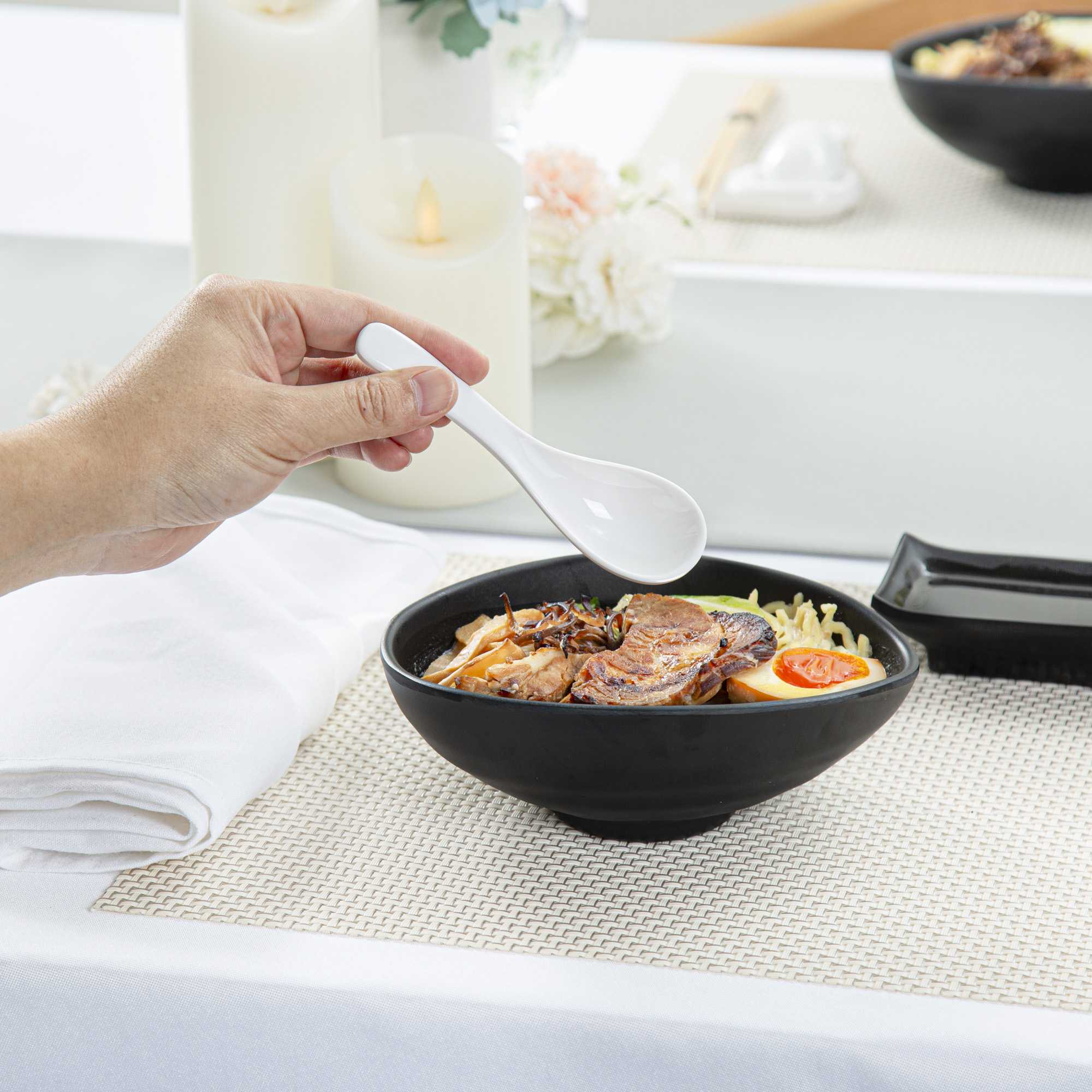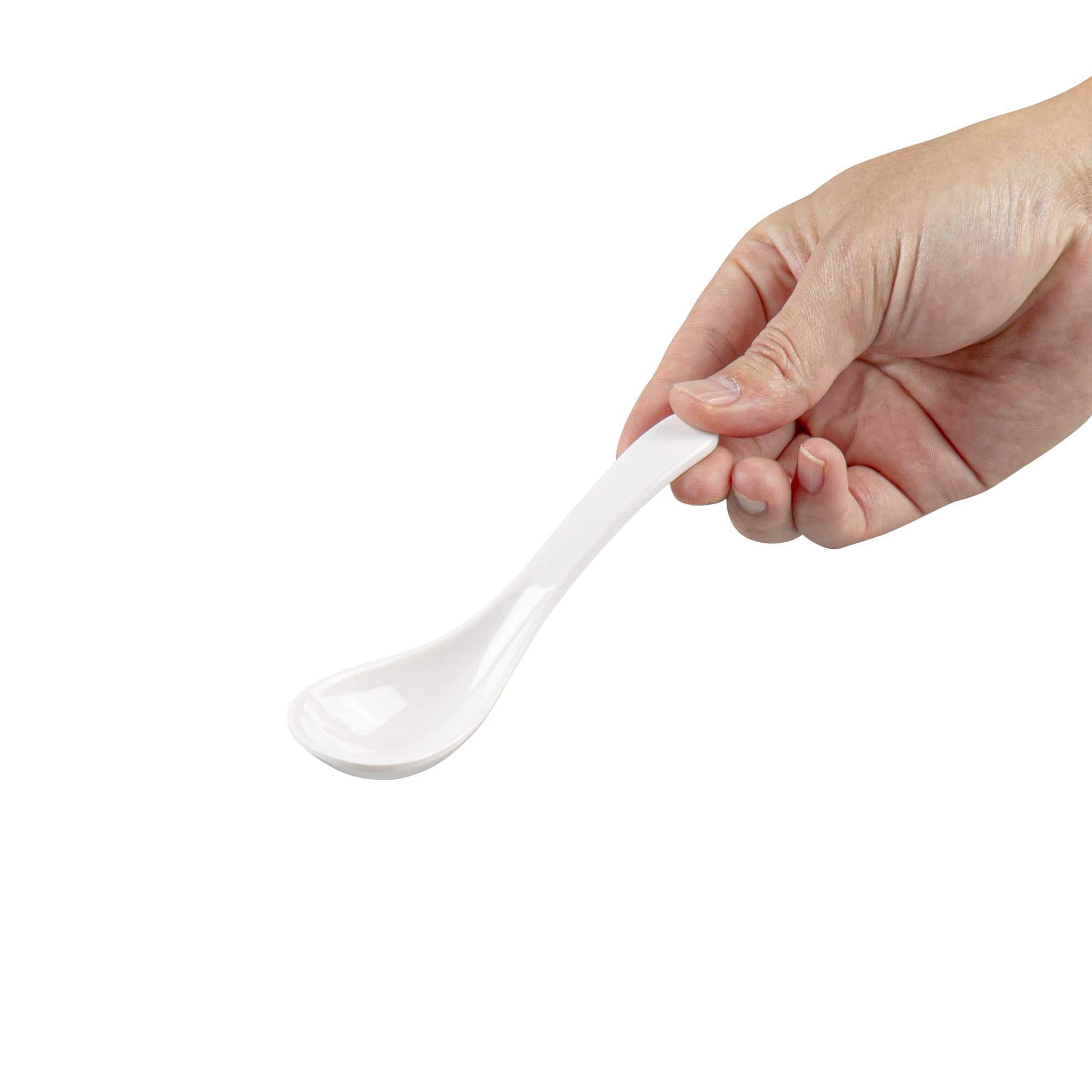 Give customers a simple way to enjoy Asian-inspired soups and broths with our Voga 1-ounce White Melamine Chinese Soup Spoon. Featuring a deep-set bowl and curved handle, these melamine soup spoons are great for scooping up big bites of pho, tom yum, or miso soup. These Asian-inspired spoon's rounded shape easily contains the perfect mixture of broth and toppings, while it's easy-to-grasp handle gives customers a comfortable way to enjoy your culinary creations. Constructed from melamine, a durable and reusable plastic, these soup spoons are made to withstand long-term commercial use in restaurants, sushi bars, catering companies, and other foodservice establishments. These melamine soup spoons feature a polished white finish and are scratch-resistant, shatterproof, and dishwasher-safe. Each of these soup spoons measures 5 inches in length. Sold in a 10 count box.