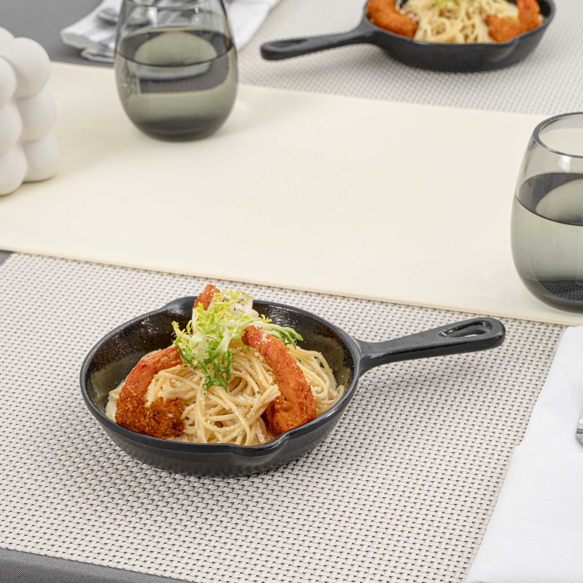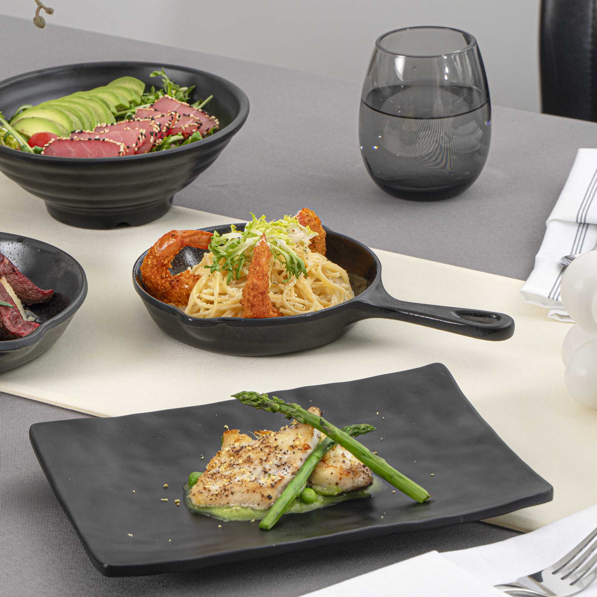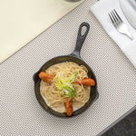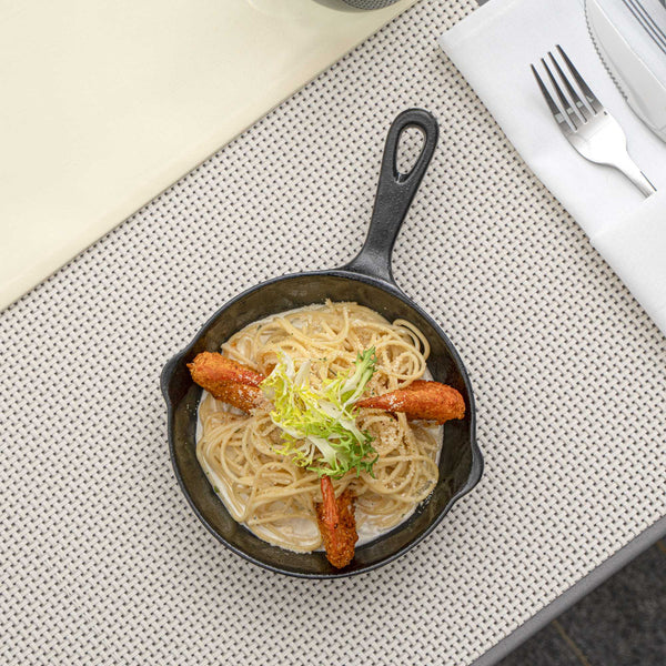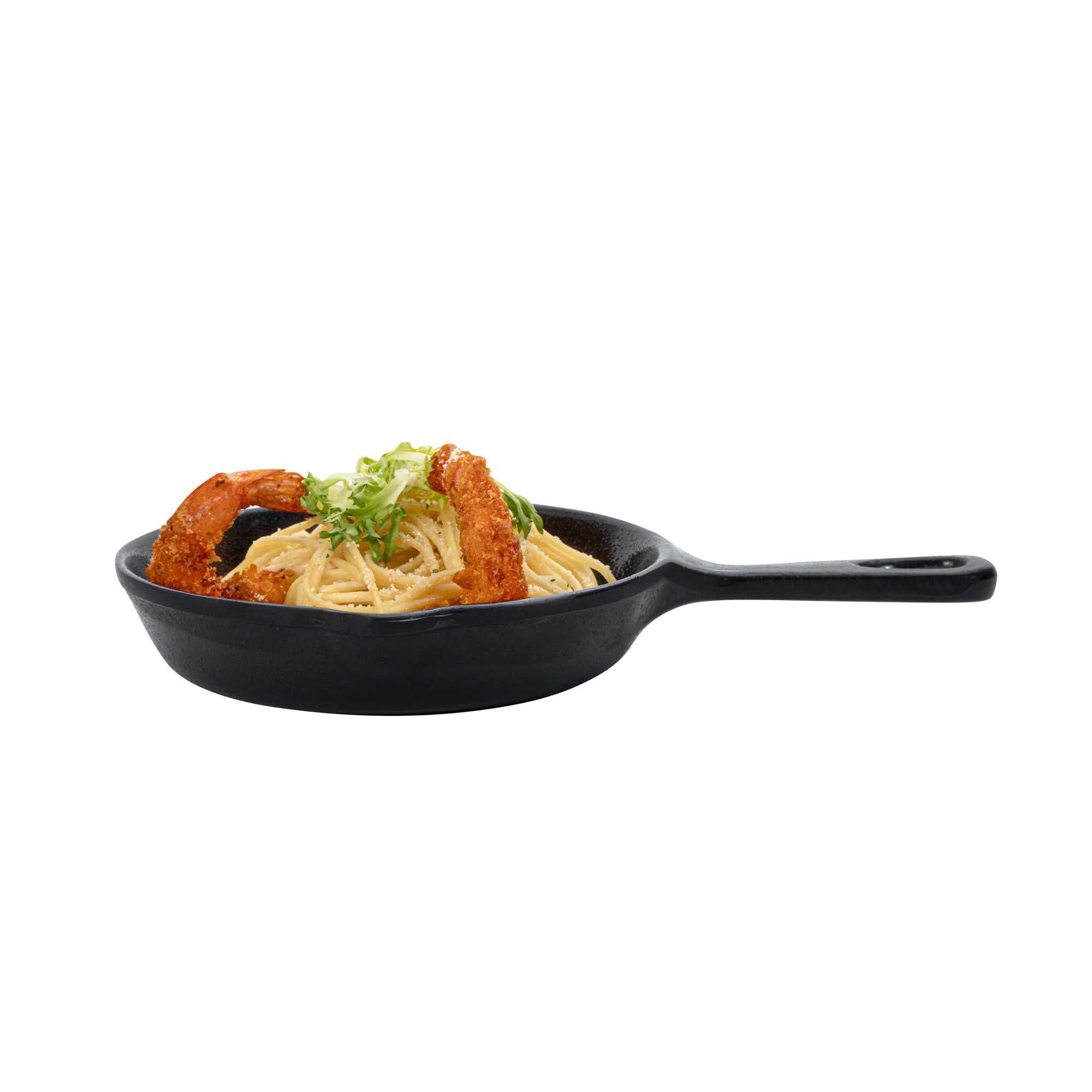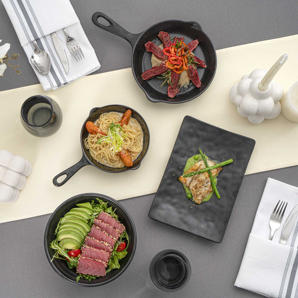 Serve mouthwatering entrees using our Voga 12-ounce Black Melamine Serving Dish with Handle. These melamine dishes are designed to mimic the appearance of traditional cast iron skillets while being lightweight and easy to handle. Made from premium melamine, these serving skillets are scratch-resistant and shatter-resistant, to easily maintain the spotless appearance of your tableware. Featuring a built-in handle, these black serving dishes provide a comfortable grip while serving and include a small hanging hole at the end to maximize storage space in your commercial kitchen. Crafted with a deep basin, these melamine dishes easily hold large entrees or desserts, and are ideal for busy catering events or large restaurants. These serving skillets have a classic black finish for a stylish touch to meals. For a quick cleanup after use, these black serving dishes are conveniently dishwasher-safe. Measuring 10 inches in length, 6.75 inches in width and 1.25 inches in height, these melamine dishes hold up to 12 ounces of food. Shipped in a 6 count box