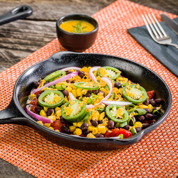 Plate savory fajitas using our Voga 16-ounce Black Melamine Serving Dish with Handle. These lightweight serving dishes are made to mimic the look of a traditional cast iron skillet. Crafted with high-quality melamine, these durable serving pans are shatter-resistant and scratch-resistant to maintain their stylish look. Designed with a handle, these melamine plates are easy to hold while carrying food to guests and include a small hanging hole at the end for easy storage in your commercial kitchen. Featuring a deep basin, these serving pans neatly hold hefty meals to serve at large catering events, banquets, or restaurants. With a black finish, these serving dishes perfectly complement the rest of your tableware. For easy cleanup after use, these serving pans are dishwasher-safe. Measuring 13 inches in length by 8.75 inches in width and 1.5 inches in height, these melamine plates are shipped in a 6 count box and hold up to 16 ounces.