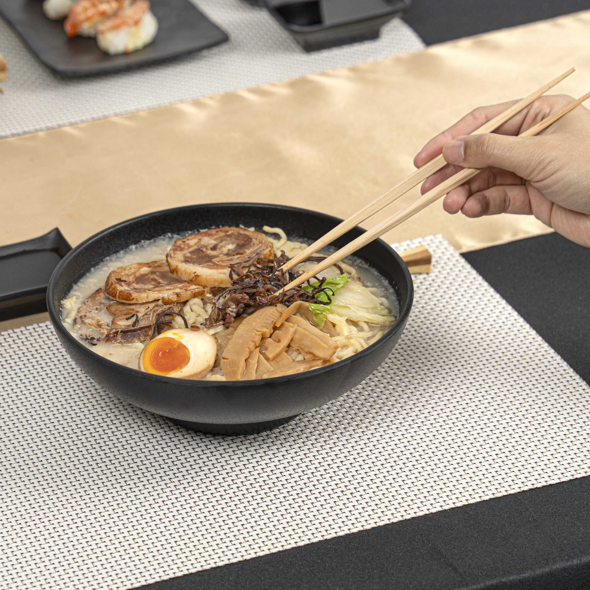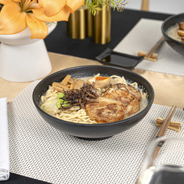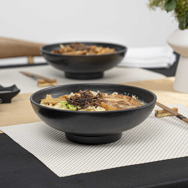 Enjoy savory soups and salads in style with our Voga 27-ounce Black Melamine Large Bowls. The faux stone design and Japanese-inspired aesthetic of these extra-large melamine bowls make them perfect for Asian restaurants. Featuring a contemporary round speckled design, these sleek black melamine bowls instantly elevate the look of your food presentation and beautify your event's tablescape. Crafted from BPA-free melamine, these large melamine bowls are naturally break-resistant to maintain their premium design for long-lasting commercial use at your foodservice establishment. Containing up to 27 ounces, these large melamine bowls are great for beautifully displaying savory chicken burrito bowls at a restaurant or for attractively serving creamy tomato basil soup at a catering event. These reusable large bowls measure 9 inches in diameter by 2.5 inches in height. Sold in a 2 count box.