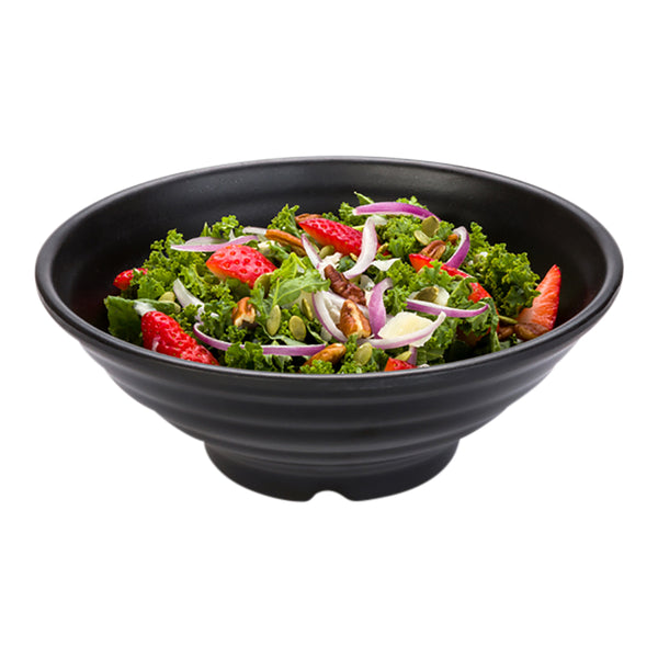 Enjoy savory soups and salads in style with our Voga 42-ounce Round Black Melamine Extra Large Bowls. The faux stone design and Japanese-inspired aesthetic of these extra-large melamine bowls make them perfect for Asian restaurants. Featuring a contemporary round design, these sleek black melamine bowls instantly elevate the look of your food presentation and beautify your event's tablescape. Crafted from BPA-free melamine, these large melamine bowls do not break easily to maintain their premium design for long-lasting commercial use at your foodservice establishment. Containing up to 27 ounces, these large melamine bowls are great for beautifully displaying savory chicken burrito bowls at a restaurant or for attractively serving creamy tomato basil soup at a catering event. These reusable large bowls measure 9 inches in diameter by 2.5 inches in height. Sold in a 2 count box.