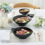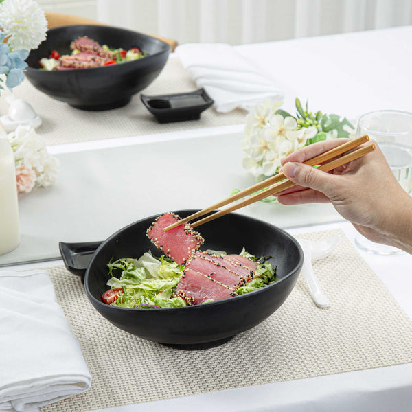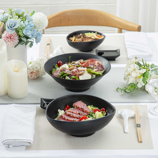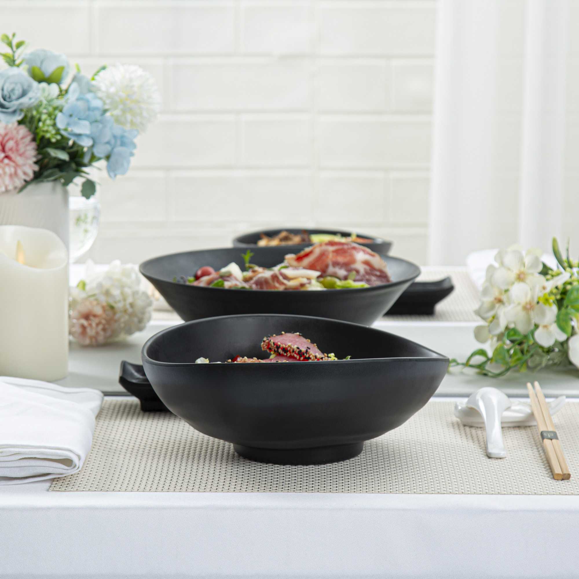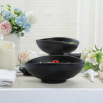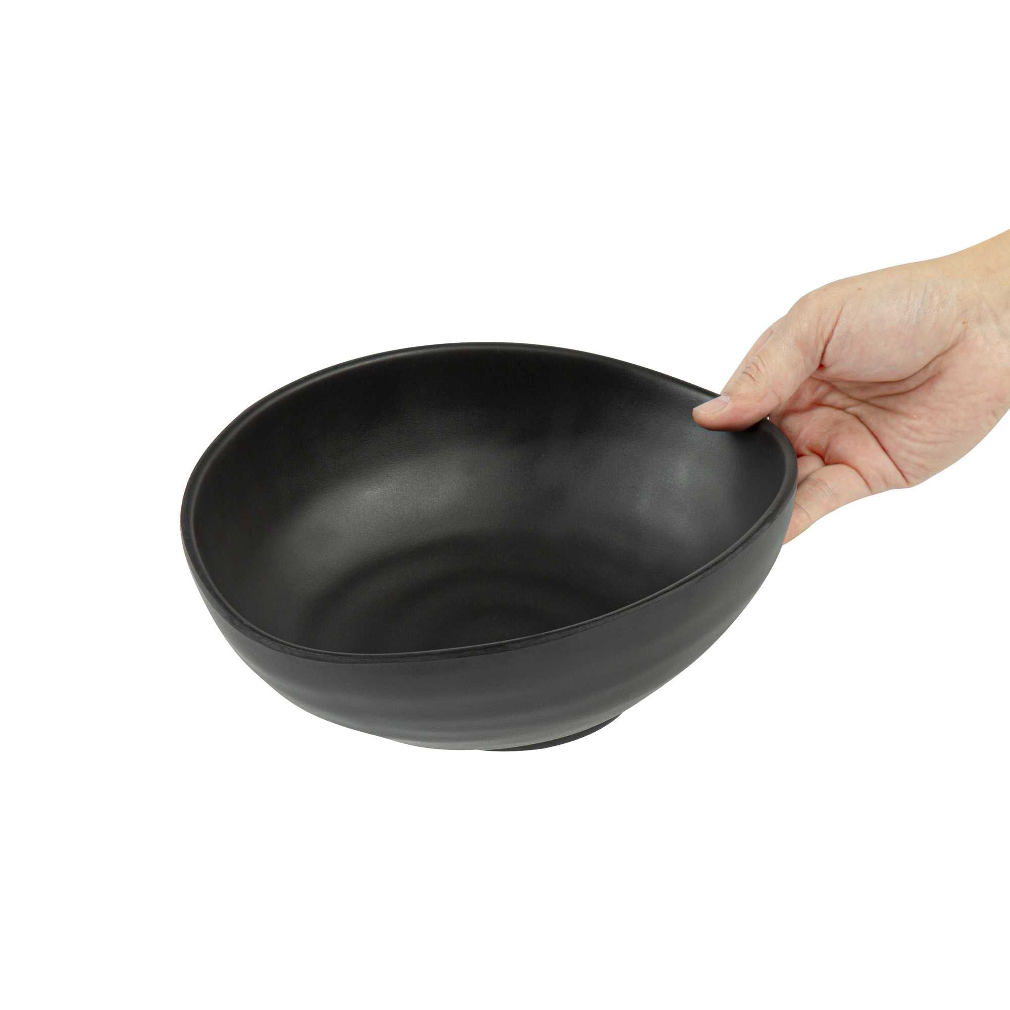 Present your fares with our Voga 44-ounce Round Black Melamine Freeform Large Bowls. These salad bowls are crafted from high-quality melamine for long-lasting durability that can withstand rigorous catering demands. The unique rim design of these melamine bowls creates an aesthetic look for your food presentation. Holding up to 44 ounces, these black bowls are perfect for serving controlled portions of your signature dishes. These serving bowls mimic the look of a black stone and complement all tablescapes with an Asian-inspired flair. To streamline your cleaning process, these soup bowls can be used in the top rack of a dishwasher. Measuring 9.5 inches long by 7.75 inches wide by 3.5 inches tall, these pasta bowls have a capacity of 44 ounces. Sold in a 2 count box.