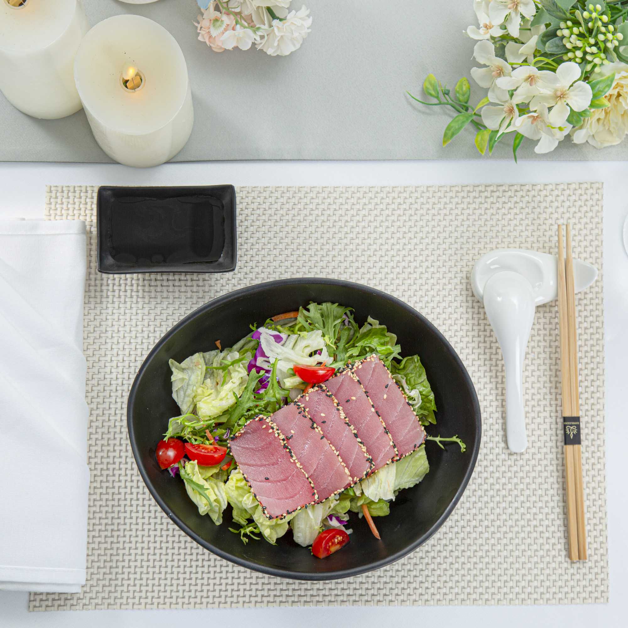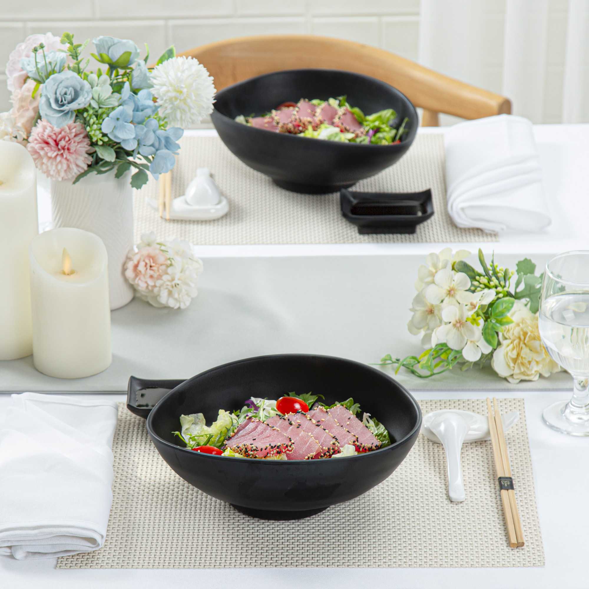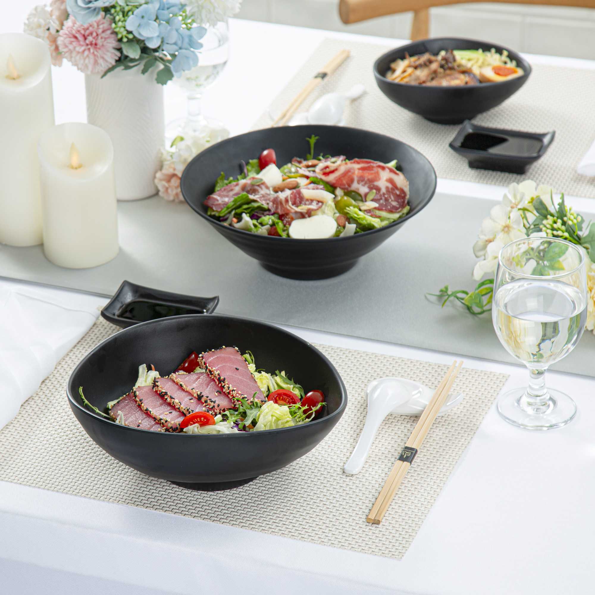 Present your fares with our Voga 44-ounce Round Black Melamine Freeform Large Bowls. These salad bowls are crafted from high-quality melamine for long-lasting durability that can withstand rigorous catering demands. The unique rim design of these melamine bowls creates an aesthetic look for your food presentation. Holding up to 44 ounces, these black bowls are perfect for serving controlled portions of your signature dishes. These serving bowls mimic the look of a black stone and complement all tablescapes with an Asian-inspired flair. To streamline your cleaning process, these soup bowls can be used in the top rack of a dishwasher. Measuring 9.5 inches long by 7.75 inches wide by 3.5 inches tall, these pasta bowls have a capacity of 44 ounces. Sold in a 2 count box.