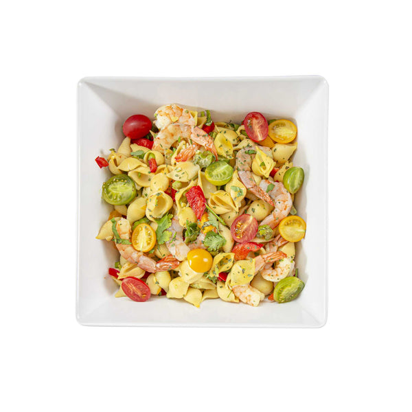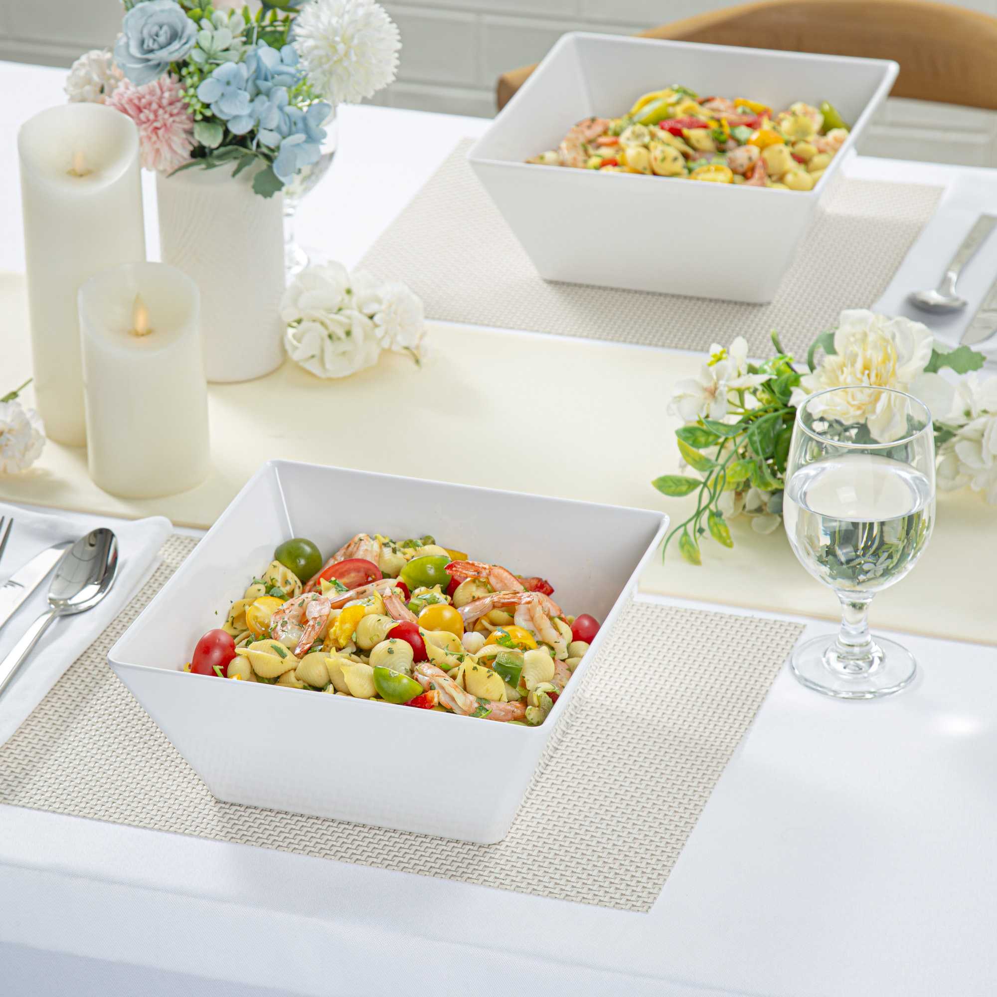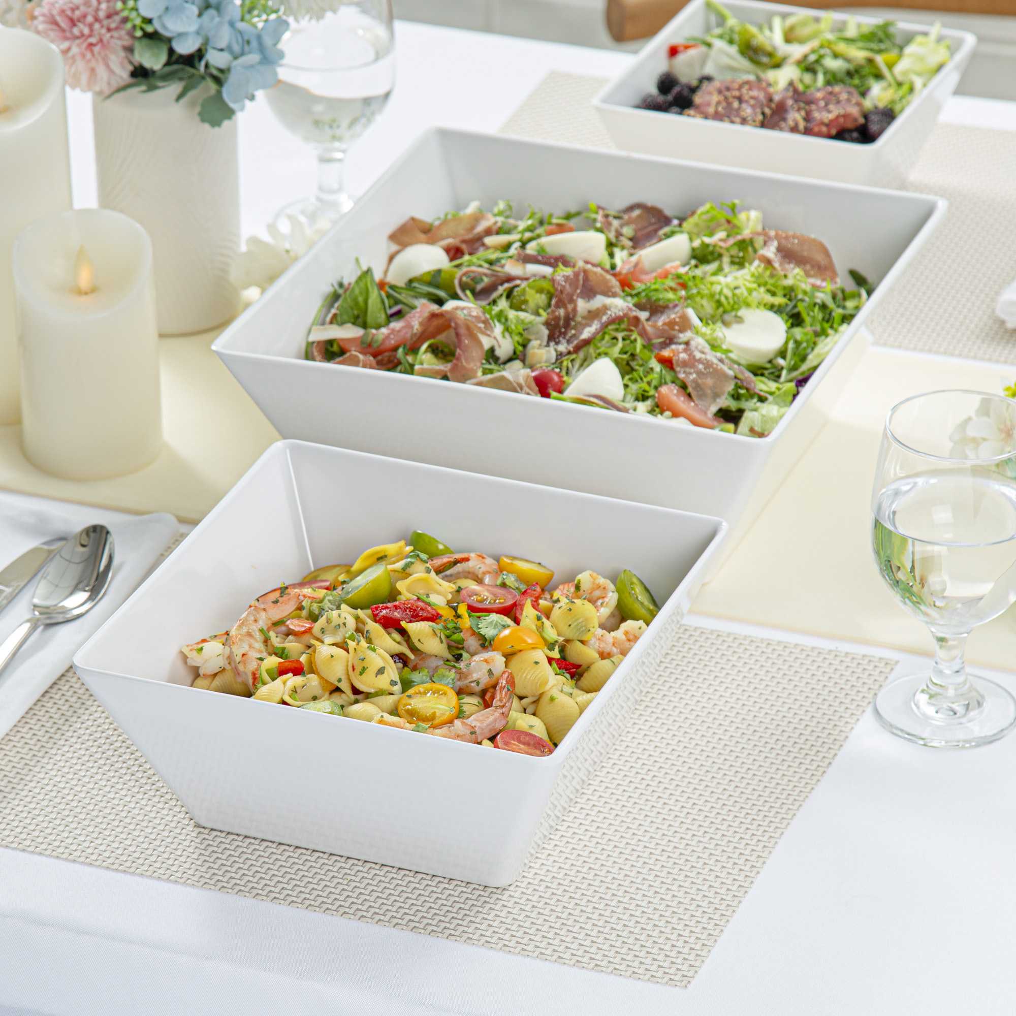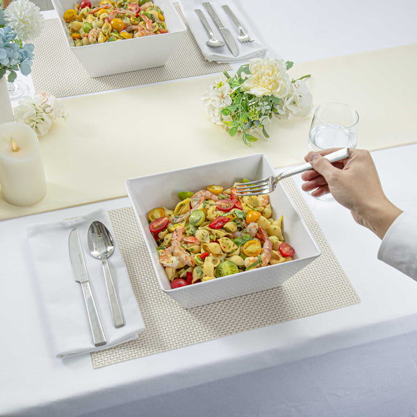 Showcase your entrees in our Voga 96-ounce Square White Melamine Serving Bowls. With a square shape, these white bowls give your buffet or serving tables an elegant look. The sophisticated white finish of these square bowls draw attention to your pastas, salads, or popcorn and create a mouthwatering display. Constructed from BPA-free melamine, these melamine serving bowls are shatter-resistant, making them perfect for daily use at your restaurant, catered event, or buffet. These square pasta bowls are dishwasher-safe for a quick and easy cleaning process at your foodservice establishment. Measuring 9.5 inches long by 9.5 inches wide by 4 inches tall, these melamine bowls hold up to 96 ounces of your snacks. Sold in a 6 count box.