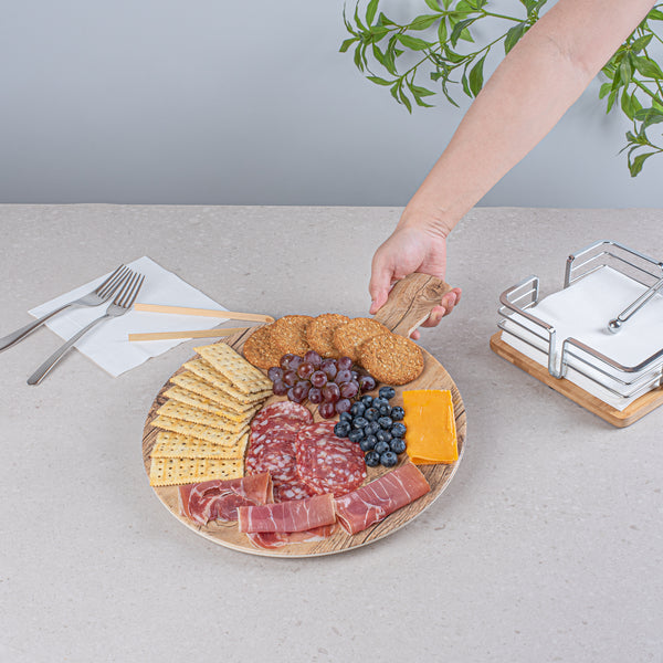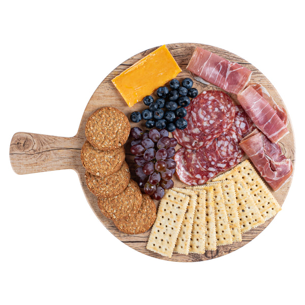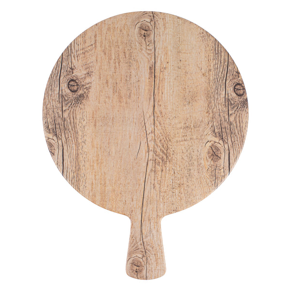 Beautifully arrange sliced meat and cheese plates using our Voga Countryside Round Brown Melamine Serving Board. This round serving board is crafted with high-quality melamine and is BPA-free to safely serve hot or cold dishes. Designed to mimic the look of a traditional wooden board, this cheese serving board is made with faux natural grooves and wood tones. Perfect for busy catered events, this melamine wood tray is built with an included handle that provides a secure grip when serving appetizers to guests. This round serving board is scratch-resistant and break-resistant to protect its rustic surface from everyday use. Great for a speedy clean up after serving, this lightweight cheese serving board is dishwasher-safe. This melamine wood tray measures 16.5 inches in length by 12.5 inches in width and 0.5 inches in height. Shipped in a 1 count box.