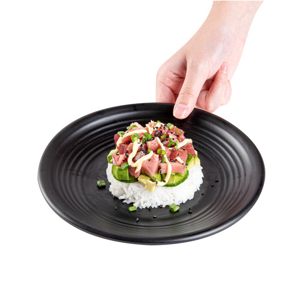 Bring sophistication to entrees with our Voga Round Black Melamine Small Plates. These dinner plates are crafted from robust melamine for premium durability and are ideal for serving hot or cold food items. Featuring a minimalist round shape, these serving plates instantly upgrade food presentations at your restaurant, bistro, and catered event. These round plates mimics the look of a black stone and are a stylish option to elegantly serve shrimp fried rice at your restaurant or to stylishly serve chicken burrito bowls at your cafe. To simplify your post-meal cleanup routine, these black plates can be conveniently used in the top rack of a dishwasher. These salad plates measure 8 inches in diameter by 1 inch in height. Shipped in a 10 count box.