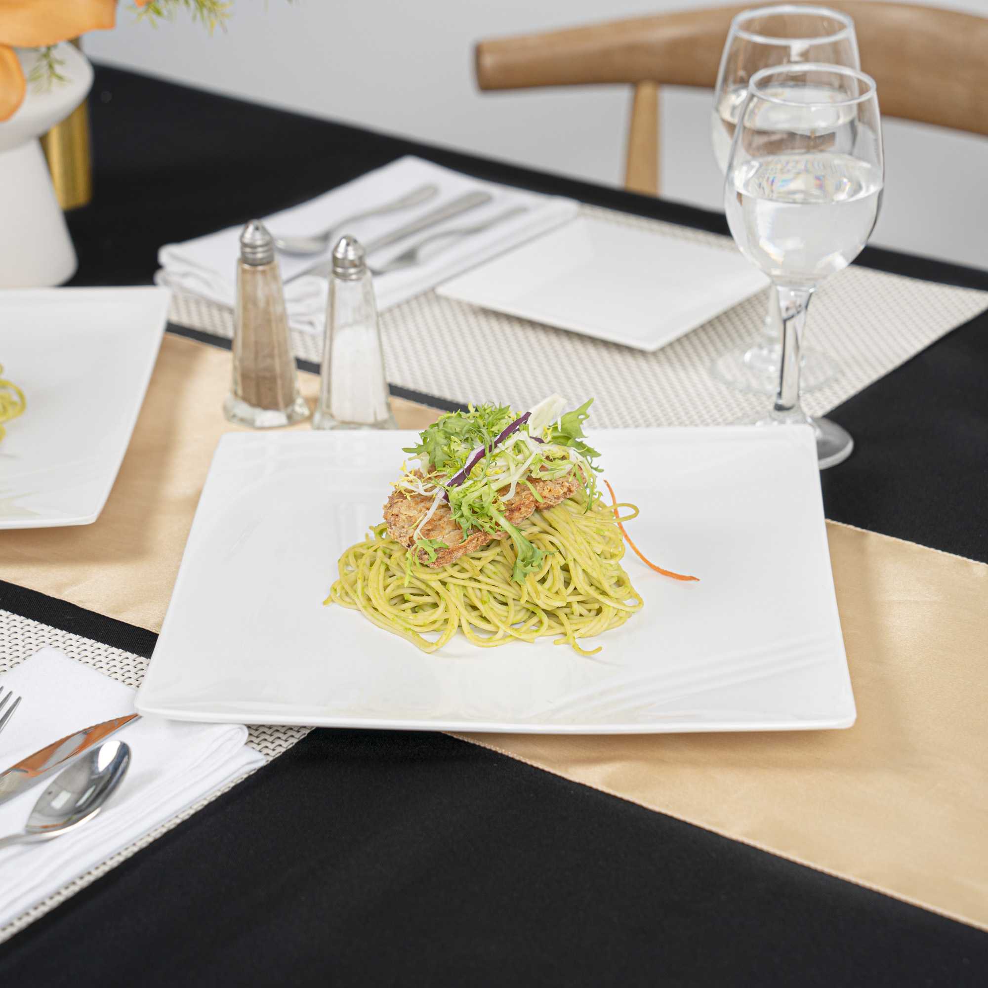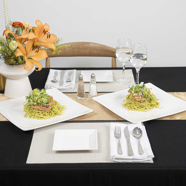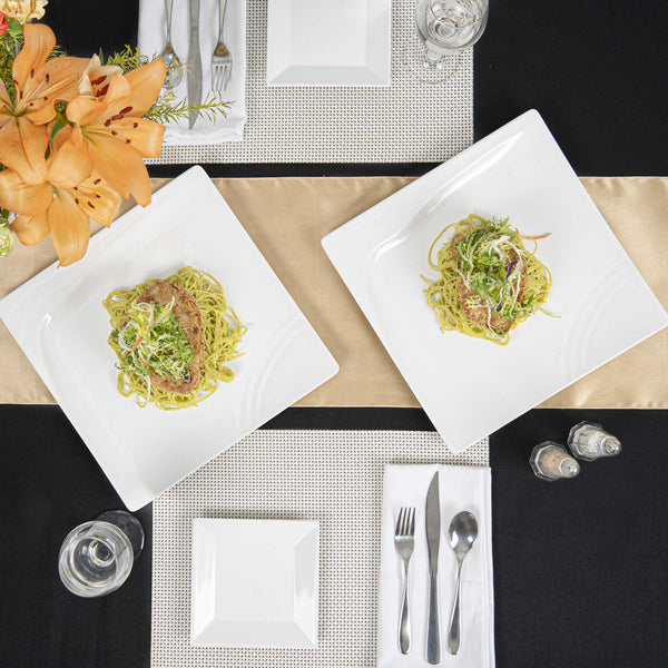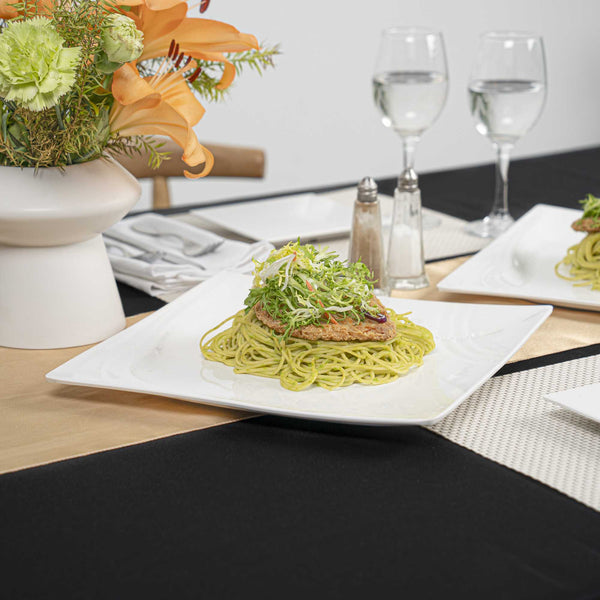 Create a beautiful food presentation with our Voga Square White Melamine Large Plates. Made from premium melamine, these white plates are durable and won't break easily, perfect for serving various food items at your restaurant. These serving plates have a chic, contemporary square design that can be used to stylishly present savory Philly cheese steak sandwiches at your bistro, or elegantly display seared scallops at your next catering event. Featuring a sophisticated white finish, these appetizer plates effortlessly complement any tablescape or venue. These square plates can be used in the top rack of a dishwasher for an easy post-meal cleanup. Each sushi plate measures 12 inches in length by 12 inches in width by 1 inch in height. Shipped in a 10 count box.
