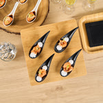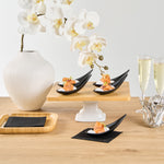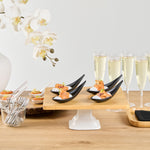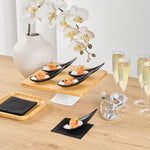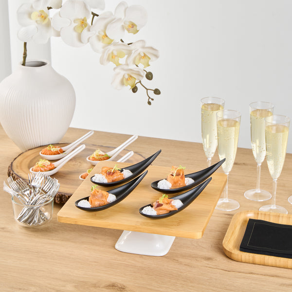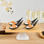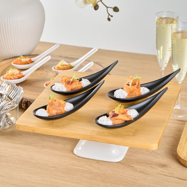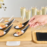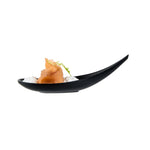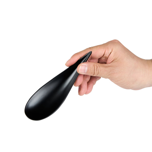 Add some eye-catching flair to your fare with these Voga Teardrop Black Melamine Tasting Spoons. These tasting spoons are crafted from high-quality melamine and won't break easily, perfect for long-lasting use at your restaurants. Featuring a contemporary teardrop design, these appetizer spoons add a sophisticated look to any event or foodservice establishment. These sample spoons have a matte black finish that creates a striking contrast for your beautifully plated tapas and hors d'oeuvres. The sleek, angled handles of these black spoons instantly upgrade your food presentation. These canape spoons can be used in the top rack of a dishwasher for a simple post-meal cleaning experience. Each melamine spoon measures 4.25 inches in length by 1.75 inches in width by 1.75 inches in height. Sold in a 10 count box.