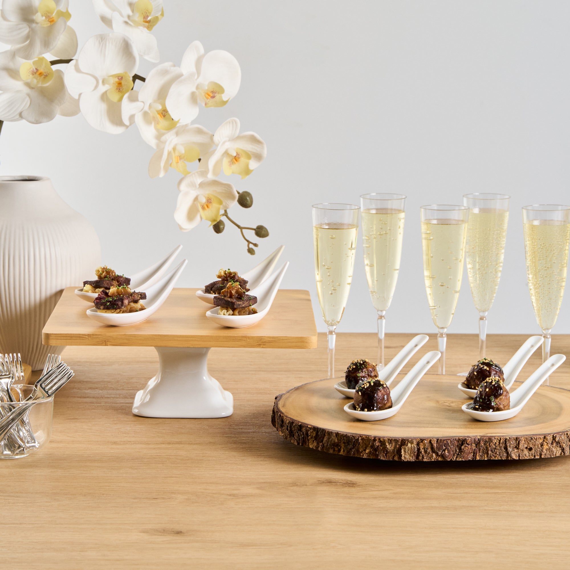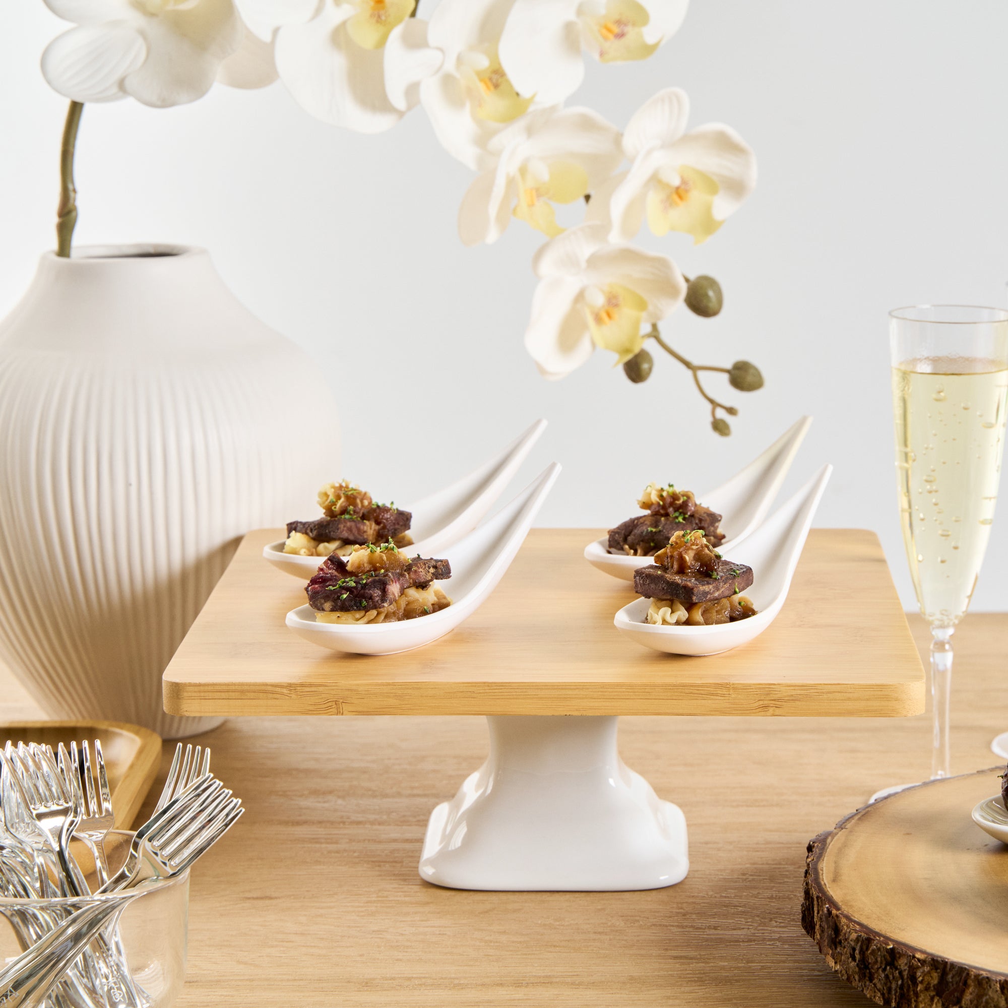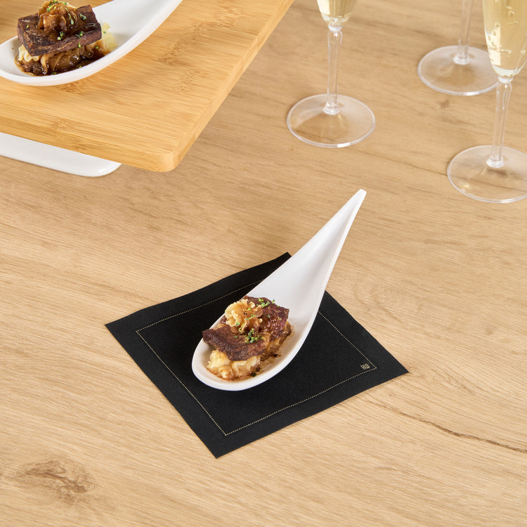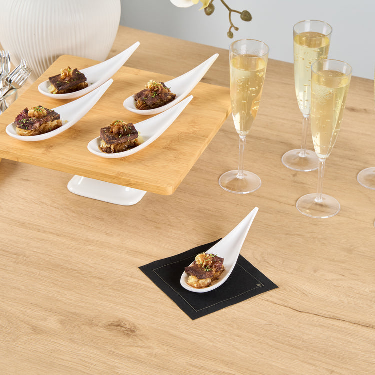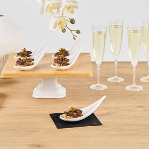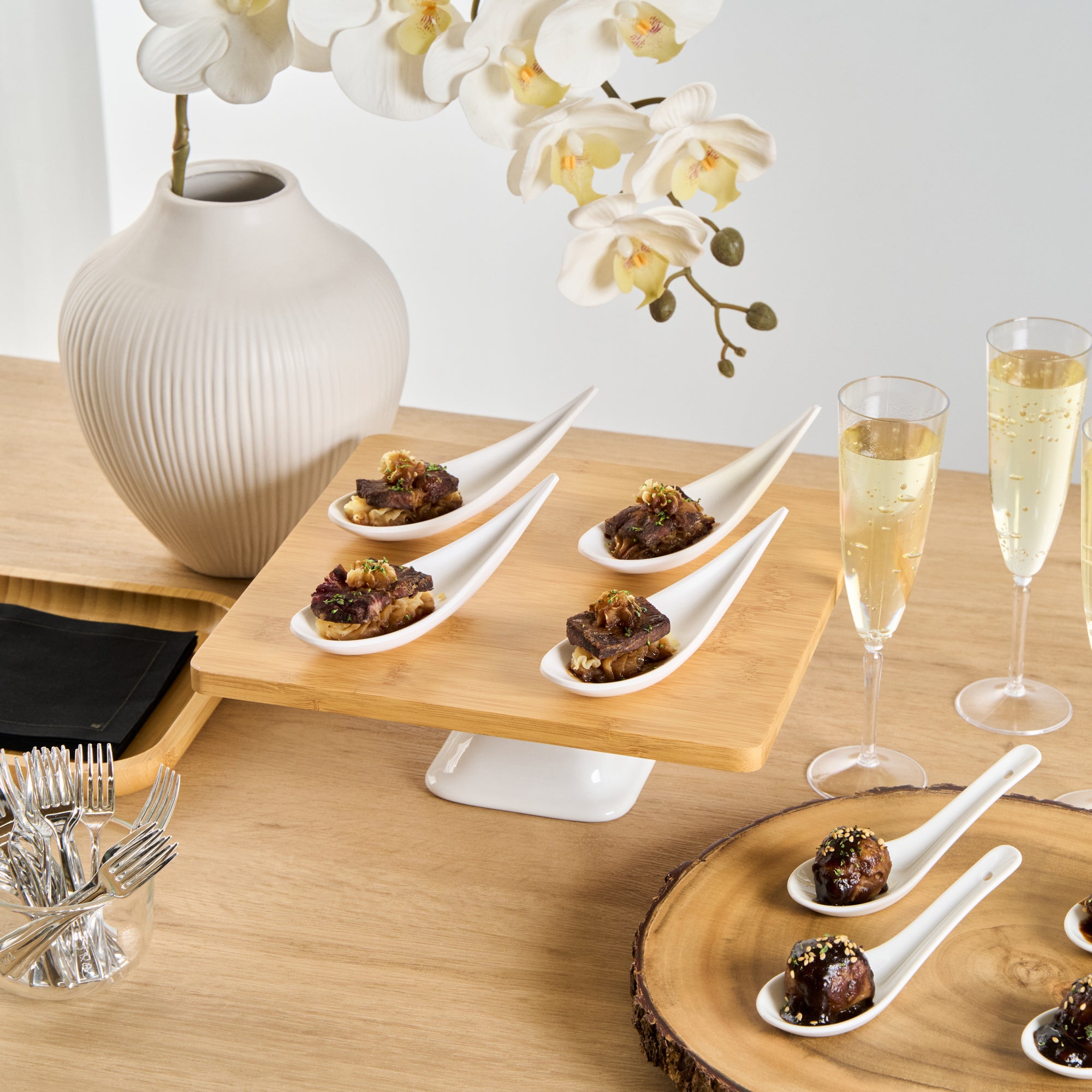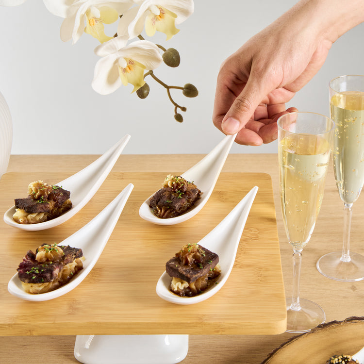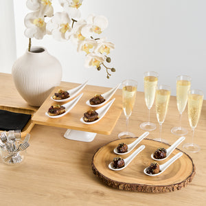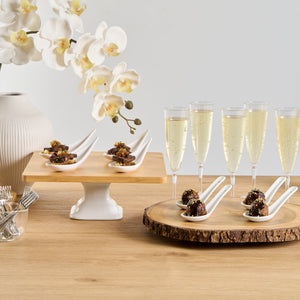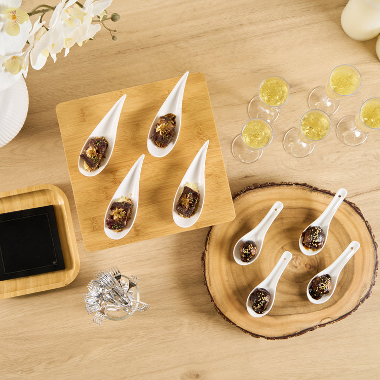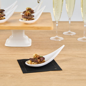Create unforgettable appetizer and dessert presentations using our Voga Teardrop White Melamine Tasting Spoons. These appetizer spoons are crafted from high-quality melamine for robust strength for long-lasting use at your foodservice establishment. With a classic white finish, these canape spoons adds a luxurious touch to bite-sized foods. The neatly curved handle of these white spoons provides an easy-to-hold grip for guests. These melamine spoons are designed with a flat base that allows them to stand on their own to beautifully display bite-sized servings of shrimp cocktail, ceviche, or desserts, making them ideal for busy catering events. For easy cleanup after use, these tasting spoons can be used in the top rack of a dishwasher. These sample spoons measure 4.25 inches in length by 1.75 inches in width by 1.75 inches in height. Sold in a 10 count box.