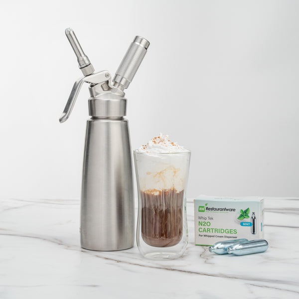 Add pizzazz to any recipe using our Whip Tek Mint 8 Gram N2O Cartridges. These nitrous oxide chargers are designed to produce up to 1 pint of mint-flavored whipped cream or foam. The mint flavor of these whipped cream dispensers makes it easy for you to add a sweet taste and touch of freshness to your beverages or desserts. These whipped cream cartridges do not leak to keep them from losing their charge before use. Coordinate these leakproof cream cartridges with our selection of whipped cream dispensers for a simple way to create one-of-a-kind dishes. These carbon steel whipped cream cartridges are conveniently recyclable for fast and hassle-free cleanup after making whipped cream. Containing up to 8 grams of pure N2O, these whipping cream cartridges are not refillable and weigh 32 grams. Available in a 100 count box. Whipped cream dispensers are available and sold separately.