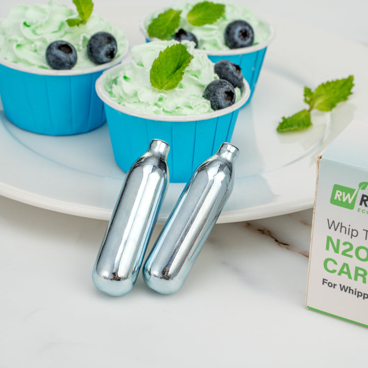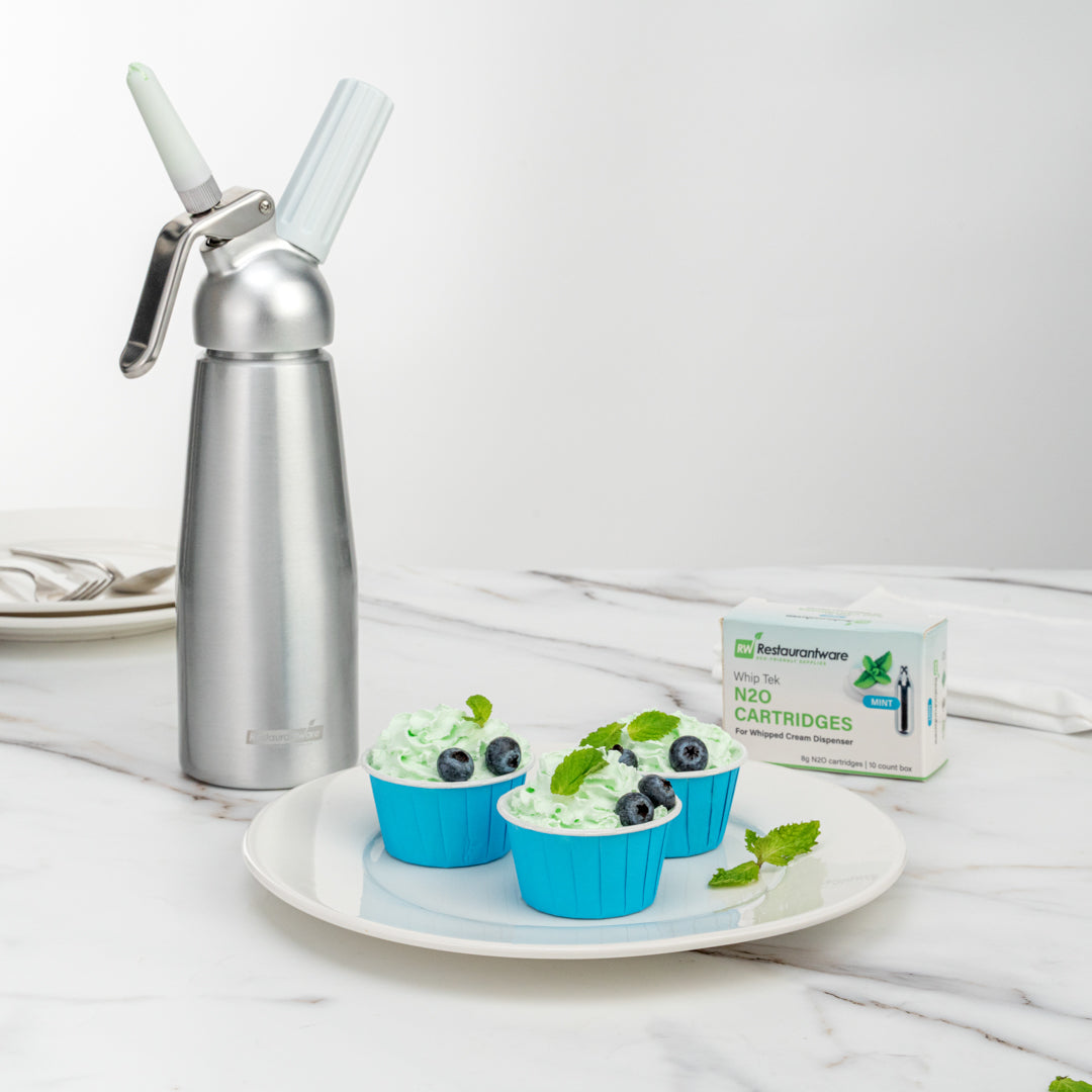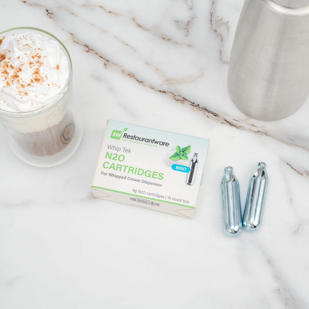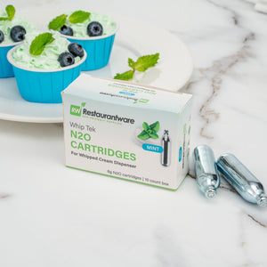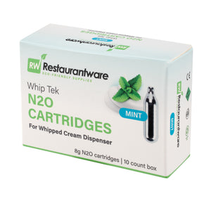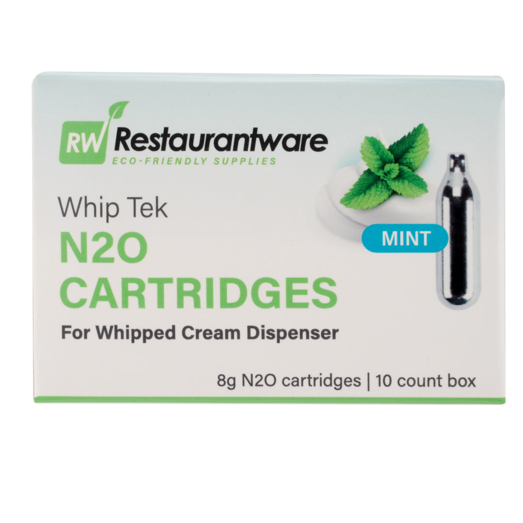 Add pizzazz to any recipe using our Whip Tek Mint 8 Gram N2O Cartridges. These nitrous oxide chargers are designed to produce up to 1 pint of mint-flavored whipped cream or foam. The mint flavor of these whipped cream dispensers makes it easy for you to add a sweet taste and touch of freshness to your beverages or desserts. These whipped cream cartridges do not leak to keep them from losing their charge before use. Coordinate these leakproof cream cartridges with our selection of whipped cream dispensers for a simple way to create one-of-a-kind dishes. These carbon steel whipped cream cartridges are conveniently recyclable for fast and hassle-free cleanup after making whipped cream. Containing up to 8 grams of pure N2O, these whipping cream cartridges are not refillable and weigh 32 grams. Available in a 100 count box. Whipped cream dispensers are available and sold separately.