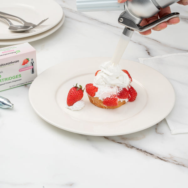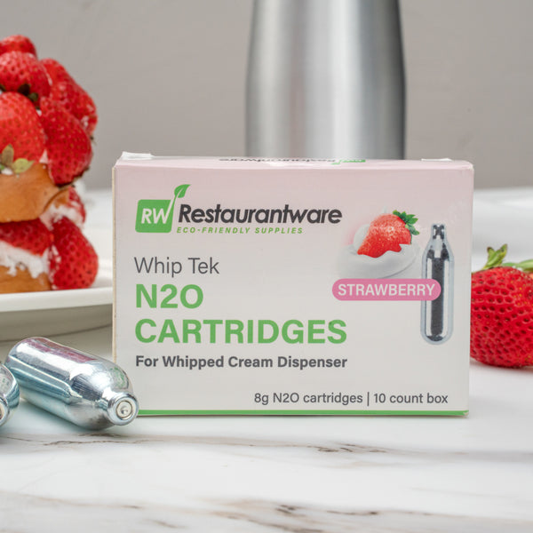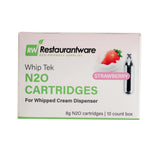 Add a hint of strawberry to your one-of-a-kind desserts using our Whip Tek Strawberry 8 Gram N2O Cartridges. Each cream dispenser produces up to 1 pint of whipped cream or foam. Filled with a strawberry flavor, these whipped cream chargers add a refreshing and sweet flavor to coffees or desserts offered at your foodservice establishment. These N2O cartridges are leakproof to ensure they are full of charge and ready to use. Pair these strawberry whipped cream charges with our collection of whipped cream dispensers to effortlessly add the finishing touches to dishes. Constructed from carbon steel, these N2O cartridges for cream dispensers are conveniently recyclable for an eco-friendly way to dispose of them after making whipped cream. Containing up to 8 grams of pure N2O, these pressurized cartridges are not refillable and weigh 32 grams. Shipped in a 10 count box. Whipped cream dispensers are available and sold separately.
