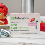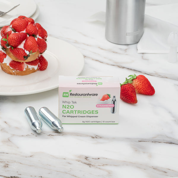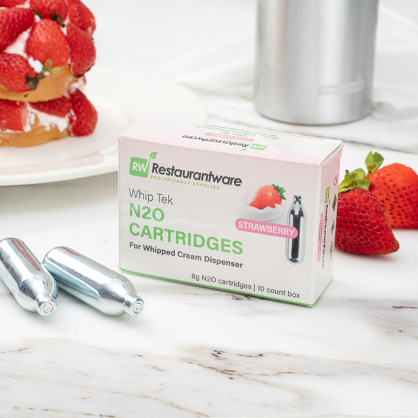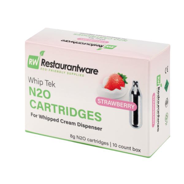 Add a hint of strawberry to your one-of-a-kind desserts using our Whip Tek Strawberry 8g N2O Cartridges. Each cream dispenser produces up to 1 pint of whipped cream or foam. Filled with a strawberry flavor, these whipped cream chargers add a refreshing and sweet flavor to coffees or desserts offered at your foodservice establishment. These N2O cartridges are leakproof to ensure they are full of charge and ready to use. Pair these strawberry whipped cream charges with our collection of whipped cream dispensers to effortlessly add the finishing touches to dishes. Constructed from carbon steel, these N2O cartridges for cream dispensers are conveniently recyclable for an eco-friendly way to dispose of them after making whipped cream. Containing up to 8 grams of pure N2O, these pressurized cartridges are not refillable and weigh 32 grams. Shipped in a 100 count box.