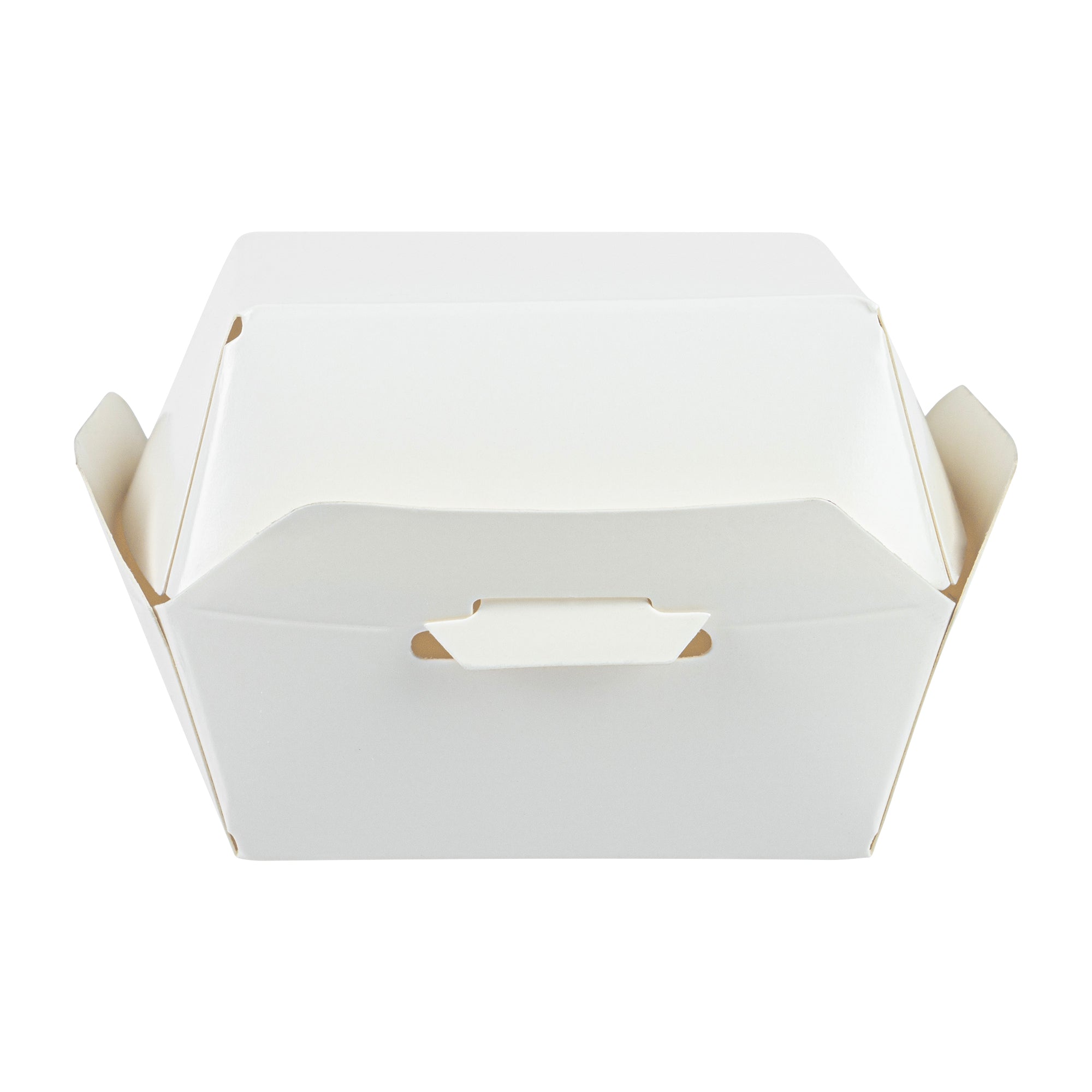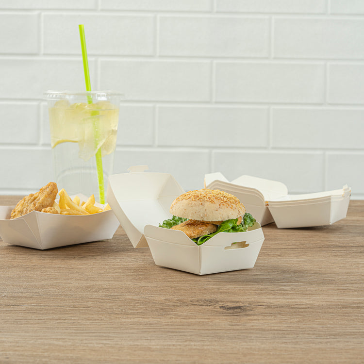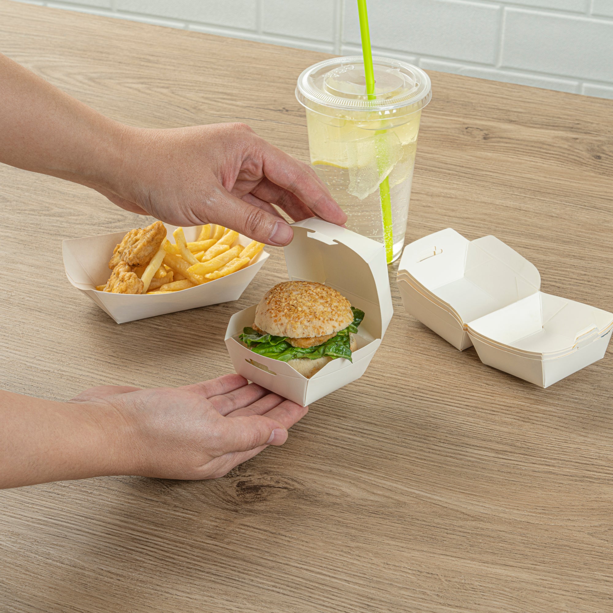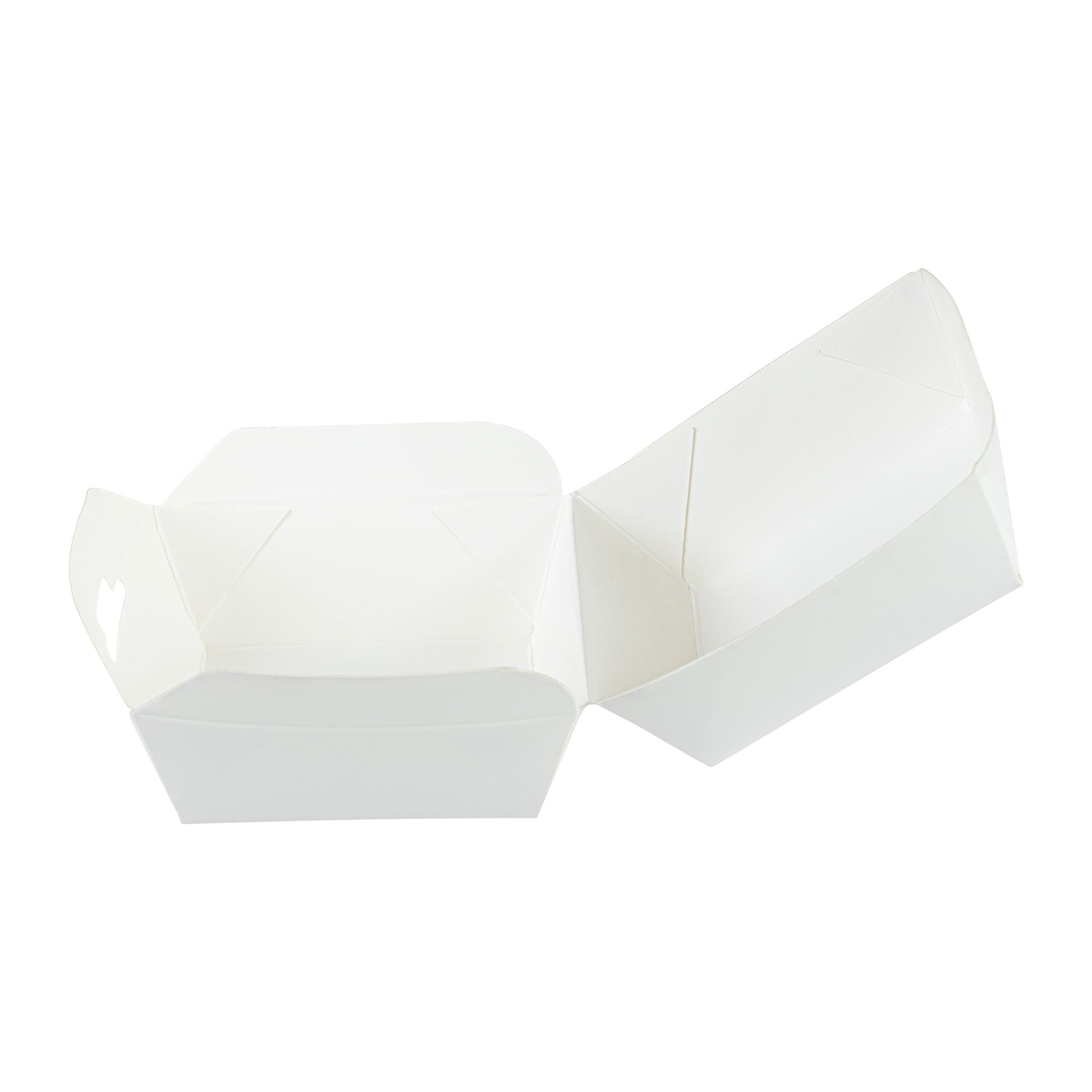 Serve miniature treats with our Bio Tek White Paper Slider Boxes. Crafted from premium paper, these slider packaging boxes have long-lasting durability. The chic white finish of these takeout boxes makes them attractive containers that are ideal for serving cookies, tarts, and sliders. To keep treats secure, these slider packaging boxes have a convenient tab lock closure. These clamshell food containers are disposable for a quick after-service cleanup. Measuring 2.5 inches in length by 2.5 inches in width by 2 inches in height, these burger boxes provide are lightweight and portable. Sold in a 100 count box.