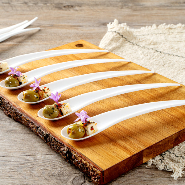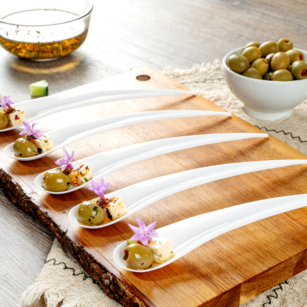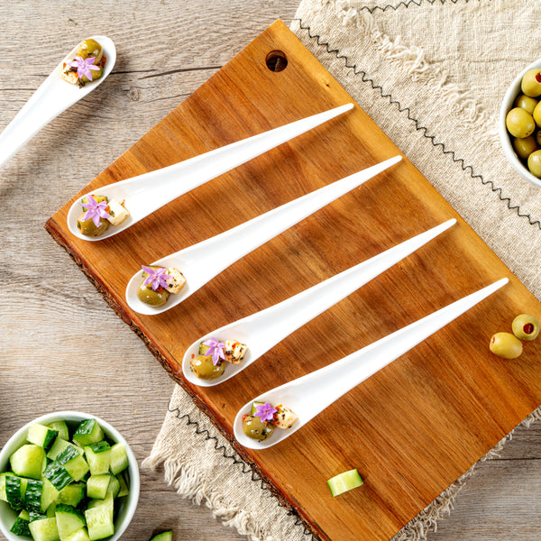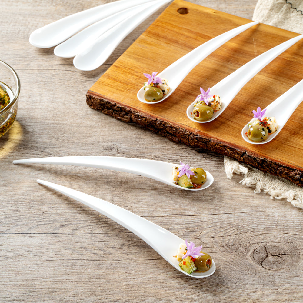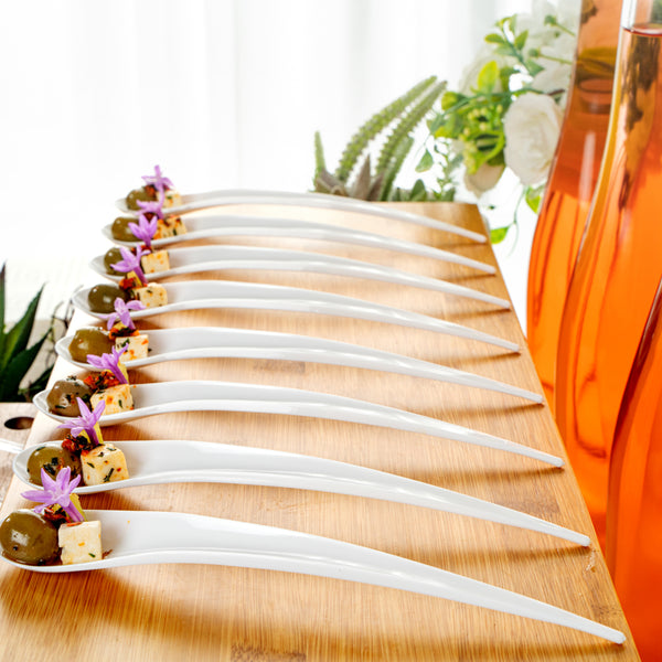 Measuring 8 inches long, these plastic spoons are ideal for all kinds of small bites. Easily serve small appetizers, samplers, or desserts!