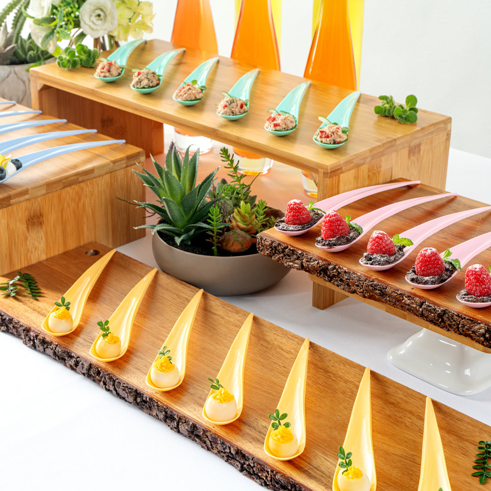 With a round, flat surface and slightly curved handle, these plastic serving spoons conveniently stand upright. Keep your samples intact!