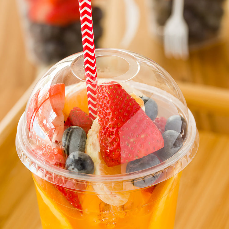 Tightly seal refreshments for transport with our Sustain Round Clear PLA Plastic Dome Lids. Made from PLA, a bioplastic derived from cornstarch, these drinking cup lids are commercially compostable to provide your patrons an eco-friendly way to enjoy smoothies, ice coffees, or bubble teas. With a dome shape, these cup lids offer plenty of room to top off beverages or snacks with toppings. These biodegradable dome lids have a built-in straw slot that allows guests to insert a straw and enjoy drinks on the go with ease. Featuring a clear finish, these PLA dome lids seamlessly showcase the colors and toppings of freshly made beverages to capture your customers' attention. Pair our 9-, 12-, 16-, and 20-ounce Sustain clear cups with dome lids to eliminate spills when serving refreshments. These drinking cup dome lids measure 3.84 inches in diameter by 3.28 inches in height. Shipped in a 1,000 count box. PLA drinking cups are available and sold separately. These items will only degrade outside of the traditional solid waste stream. NOTE: Store and use under 105F. Avoid prolonged exposure to direct sunlight. Suitable for cold beverages only.